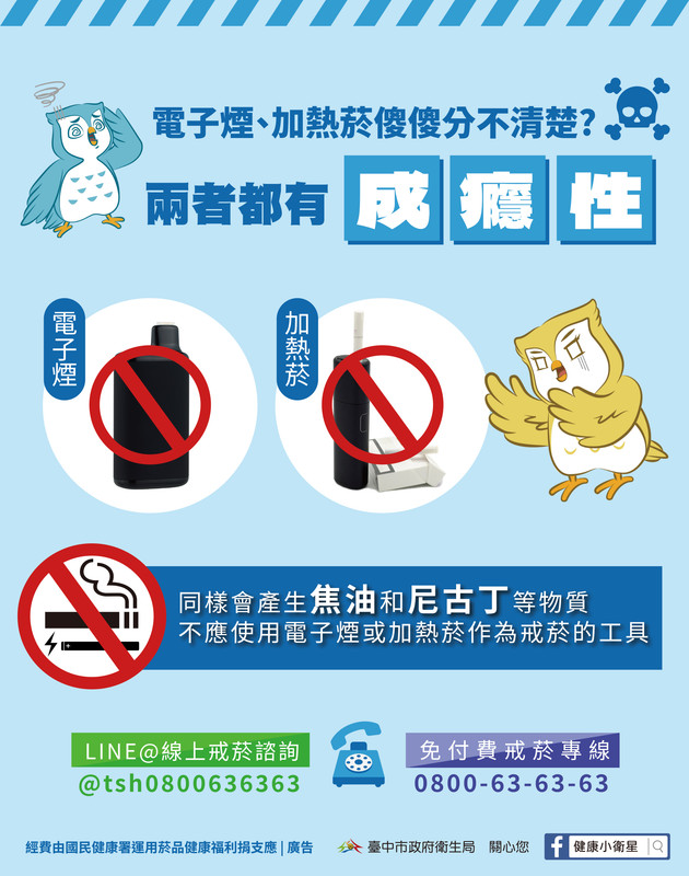 ・電子煙、加熱菸都有成癮性,同樣會產生焦油和尼古丁,千萬別當作戒菸工具!