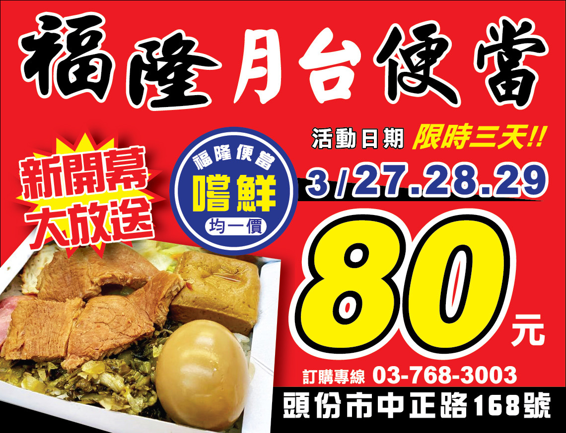 | 福隆月台便當 新開幕大放送!限時三天 全品項便當 通通均一價只要 80 元! #開幕廣播車 #活動廣告車 #廣告服務宣傳